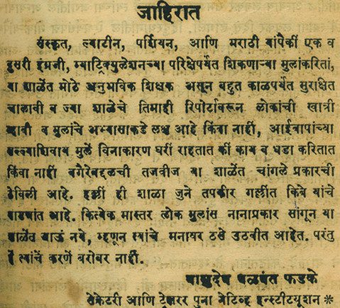 Advertisement in the Dnyanachakshu given by Vasudev Balwant Phadke appealing to students to enroll in the